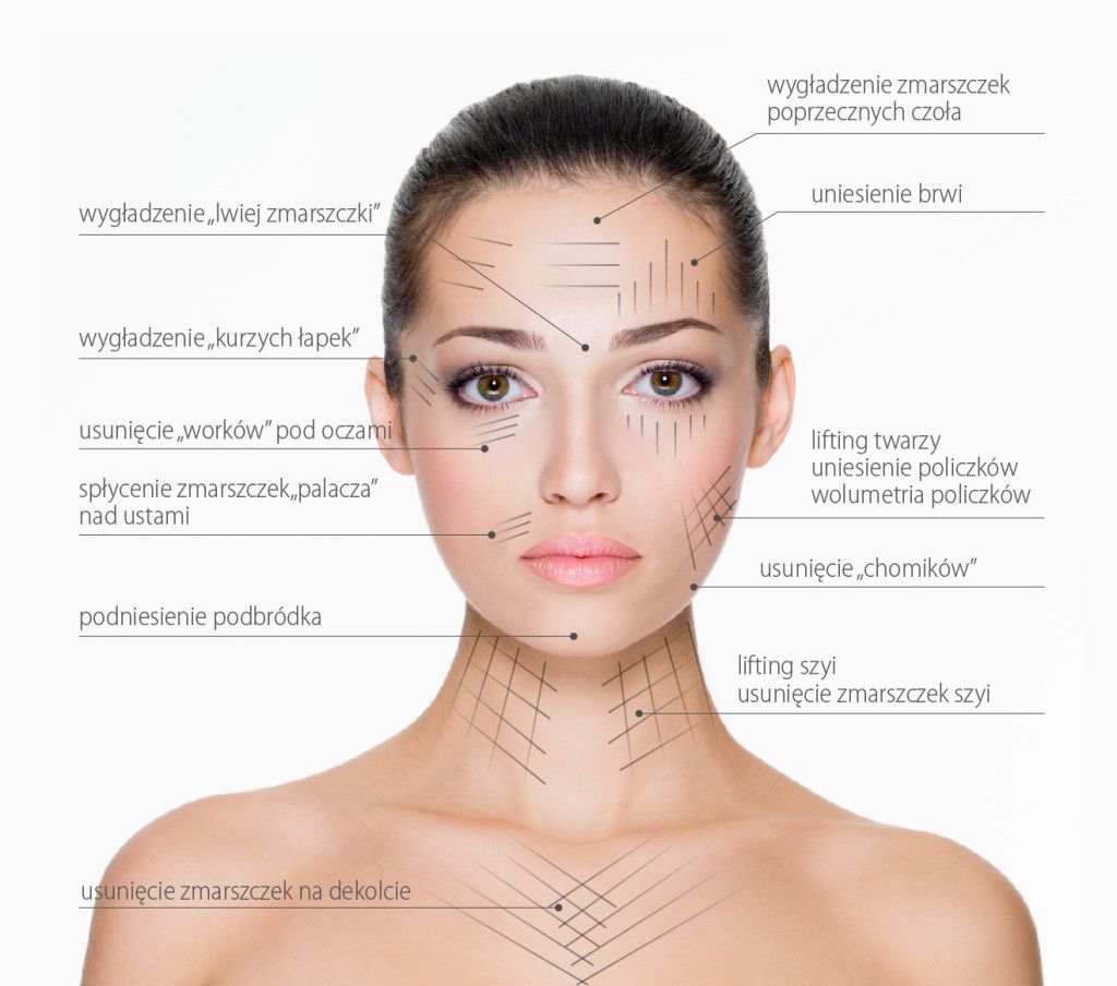 - wypełnianie zmarszczek mimicznych i chronologicznych